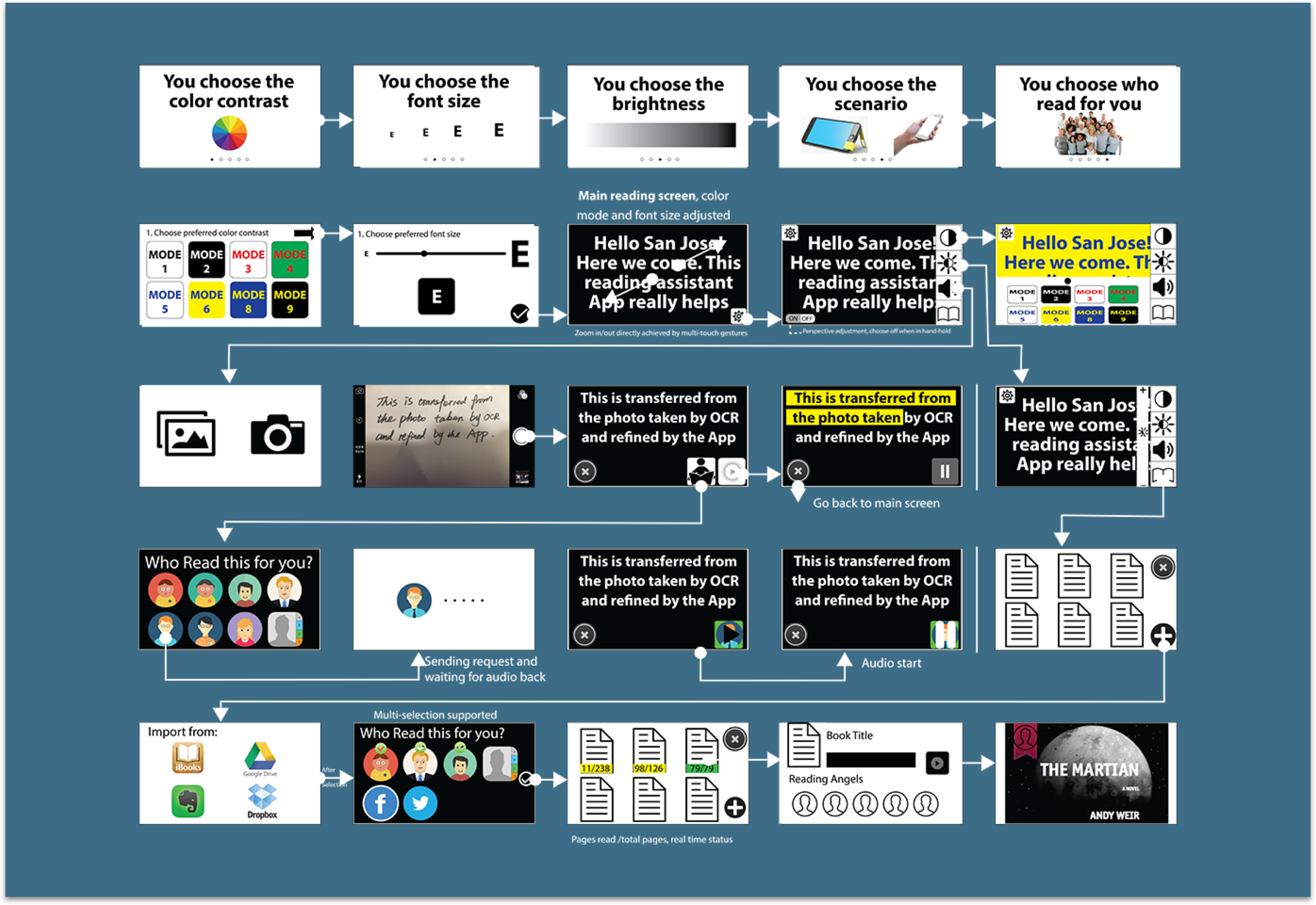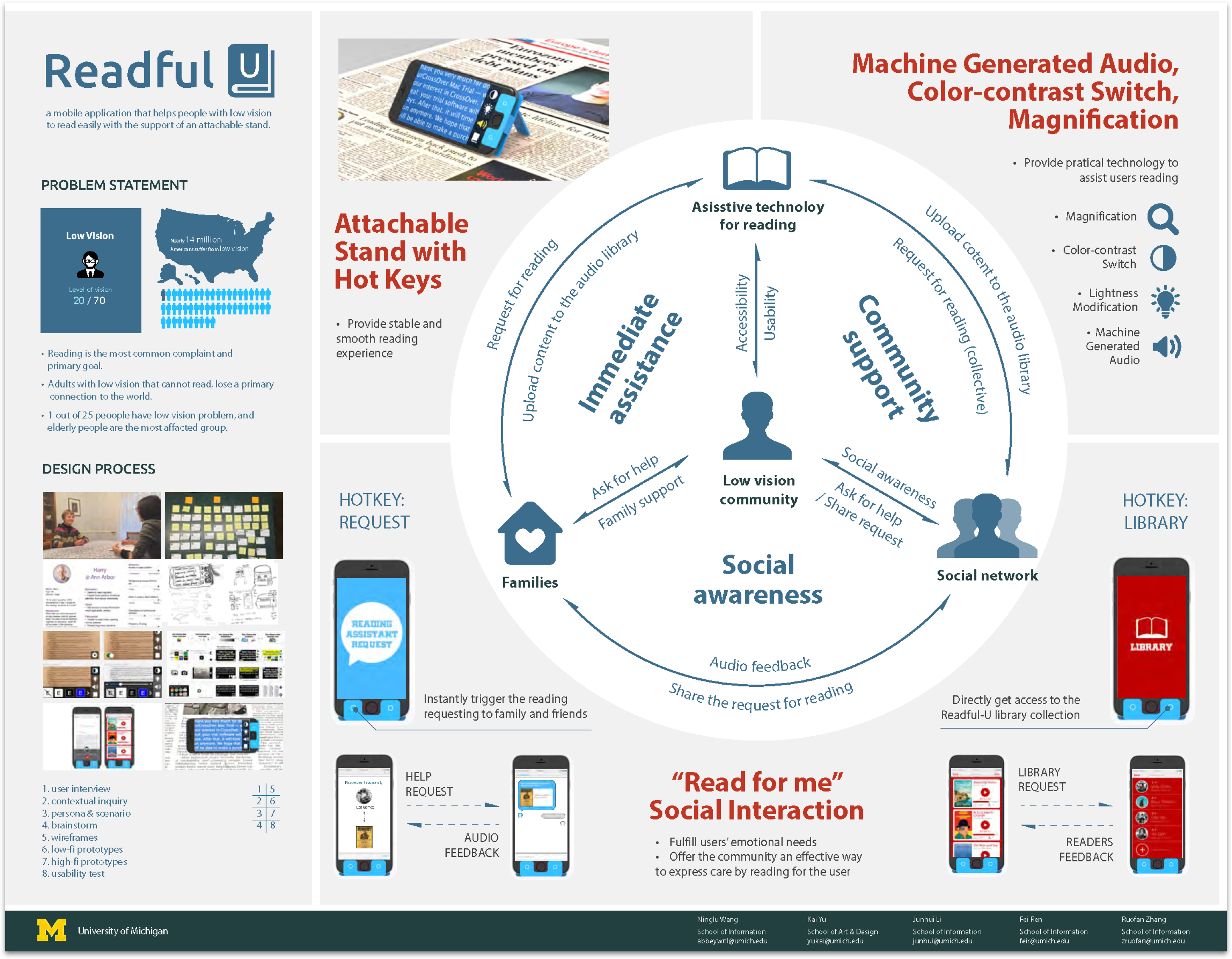 "Readful-U" means a lot to me, since it's the first project that I could work with a team to go through a complete user centered design process. During the process, I applied the methodology learned in class to the real world, and gained direct experience in every step. Moreover, I realized how crucial the target user should be during the whole design process by getting valuable feedback from them in every iteration of design. In addition, I hope this 5-month project could help the low vision group to gain more social awareness and public attention, so that this particular group could get more assistant from the community, thus enjoying a better life. Finally, I really appreciate my team, from whom I learned how to collaboratively work on a design project and to deal with the heavy workload under a high pressure. Thanks to "Readful-U", we entered the final round of 2016 CHI Conference Student Design Competition.