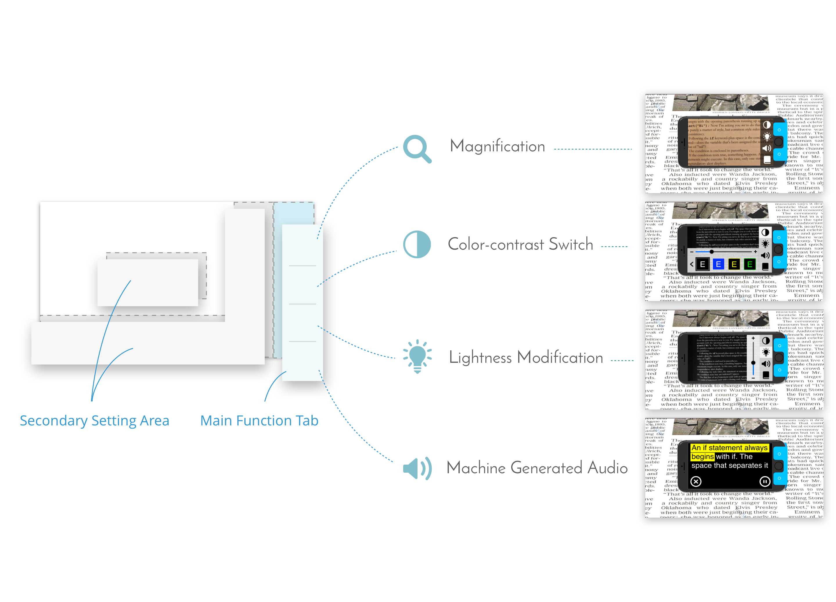 In the usability testing section, the users indicated that we should prioritize visibility of elements much higher than aesthetics. Through using enlarged buttons and simple high-contrast colors, the elements on the user interface are presented in the best way to help users locate them. They also found that, by using the stand, their hands were freed and necks relaxed. They felt less tired and could read for a longer time.They told us that the physical buttons on the stand are easier to locate than virtual buttons, because when the stand was attached, functions were easier to access.
