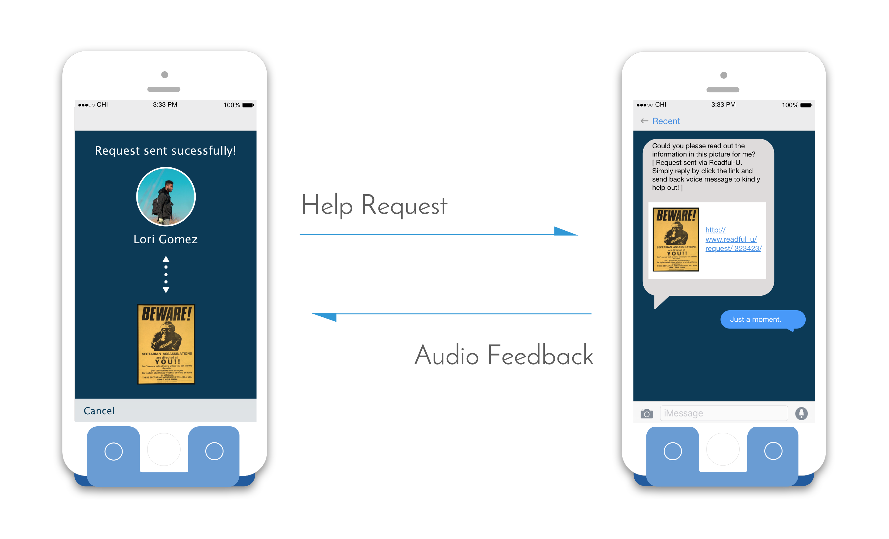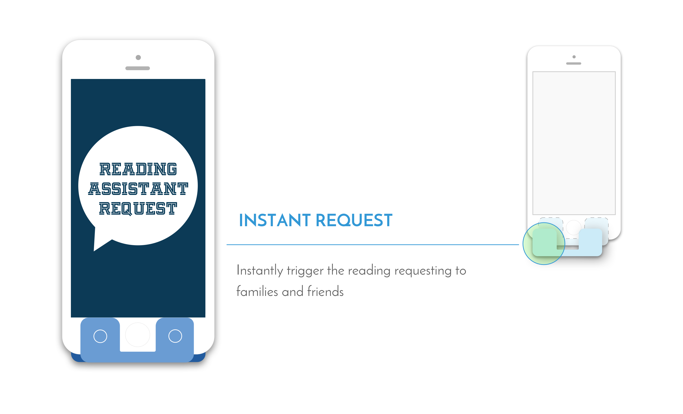 By pressing the left hotkey on the stand, users are able to send reading requests to friends and family asking them to read contents. The request receiver could respond by sending back voice messages without downloading the App.