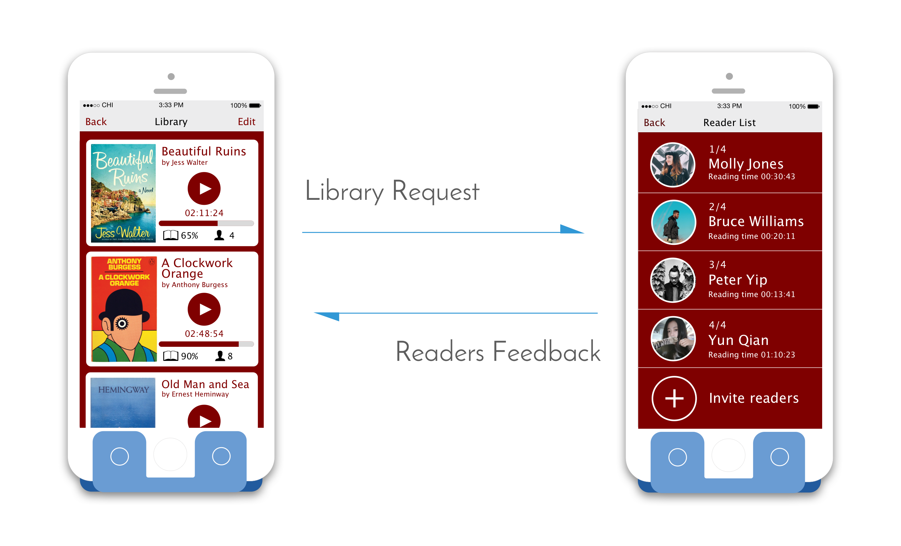 The right hotkey on the stand enable users direct access to the Readful-U library collection. Users can listen to existing audio books, view the profile of "reading angles" and invite more people to read for them via private request messages or even post to social media.