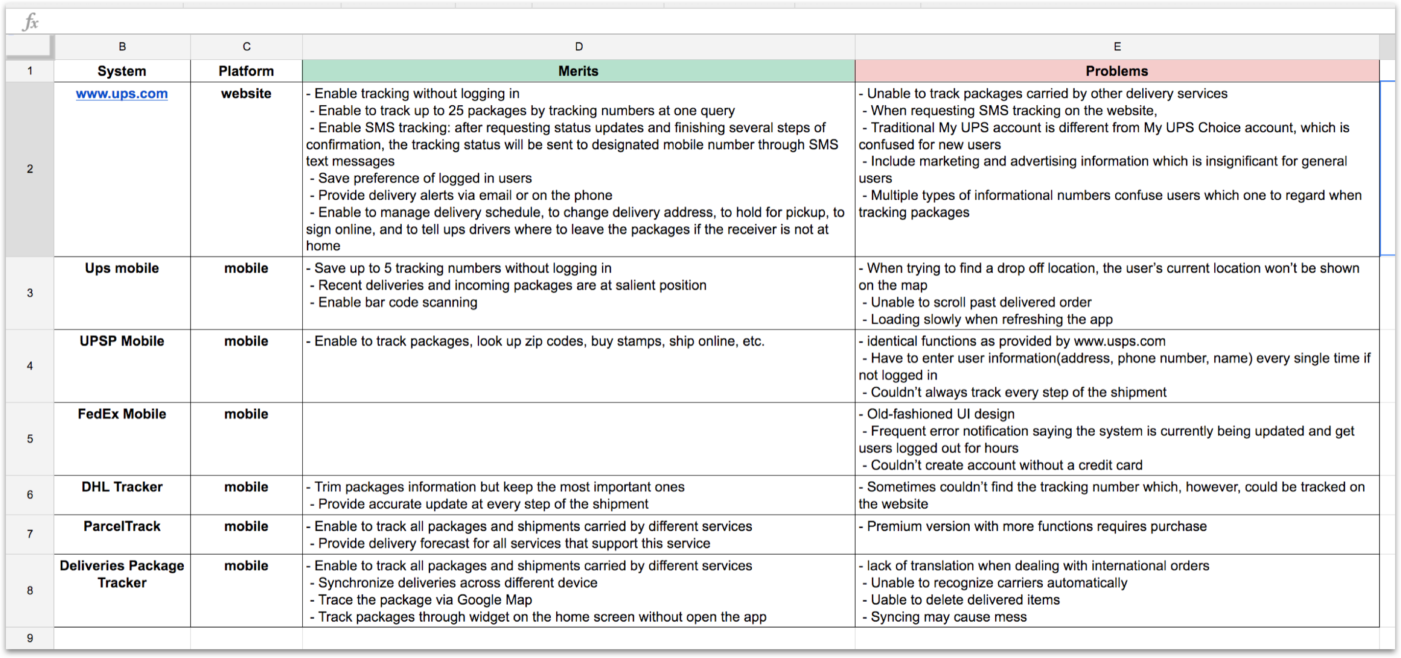 Websites and mobile applications of mainstream delivery services share most features. The most primary advantage is that they provide integrated platforms of rich functionality, consisting of multiple tracking methods: by tracking numbers, shipment reference, bar codes etc., and other information such as creating shipment and branding advertise. The disadvantage,at the same time, is distinct: none of them provides tracking services of packages carried by other delivery services. On contrast, applications like PacelTrack aims at providing cross-services packages tracking service, but lack of preference setting function to choose how the packages will be delivered.
