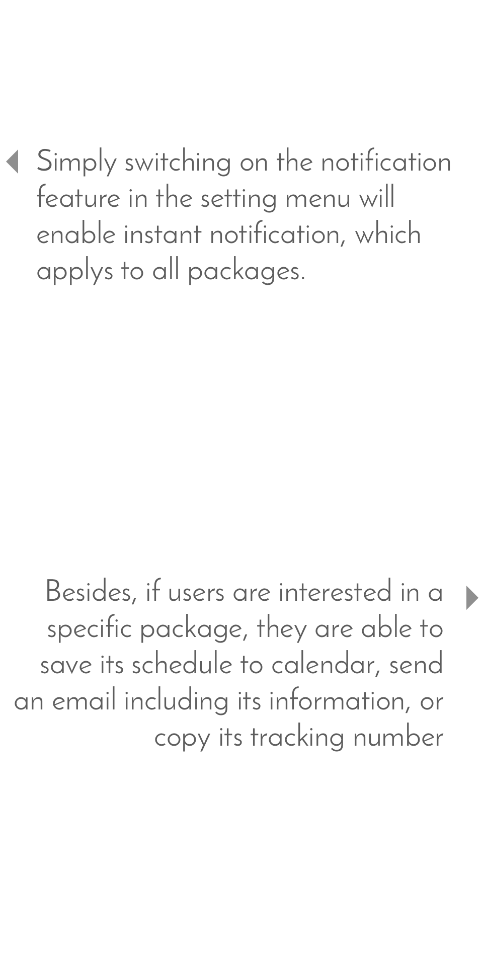 Packages carried by no matter which delivery service could be tracked at the same time. To track a new shipment, users can either scan the bar code or manually input the tracking number.