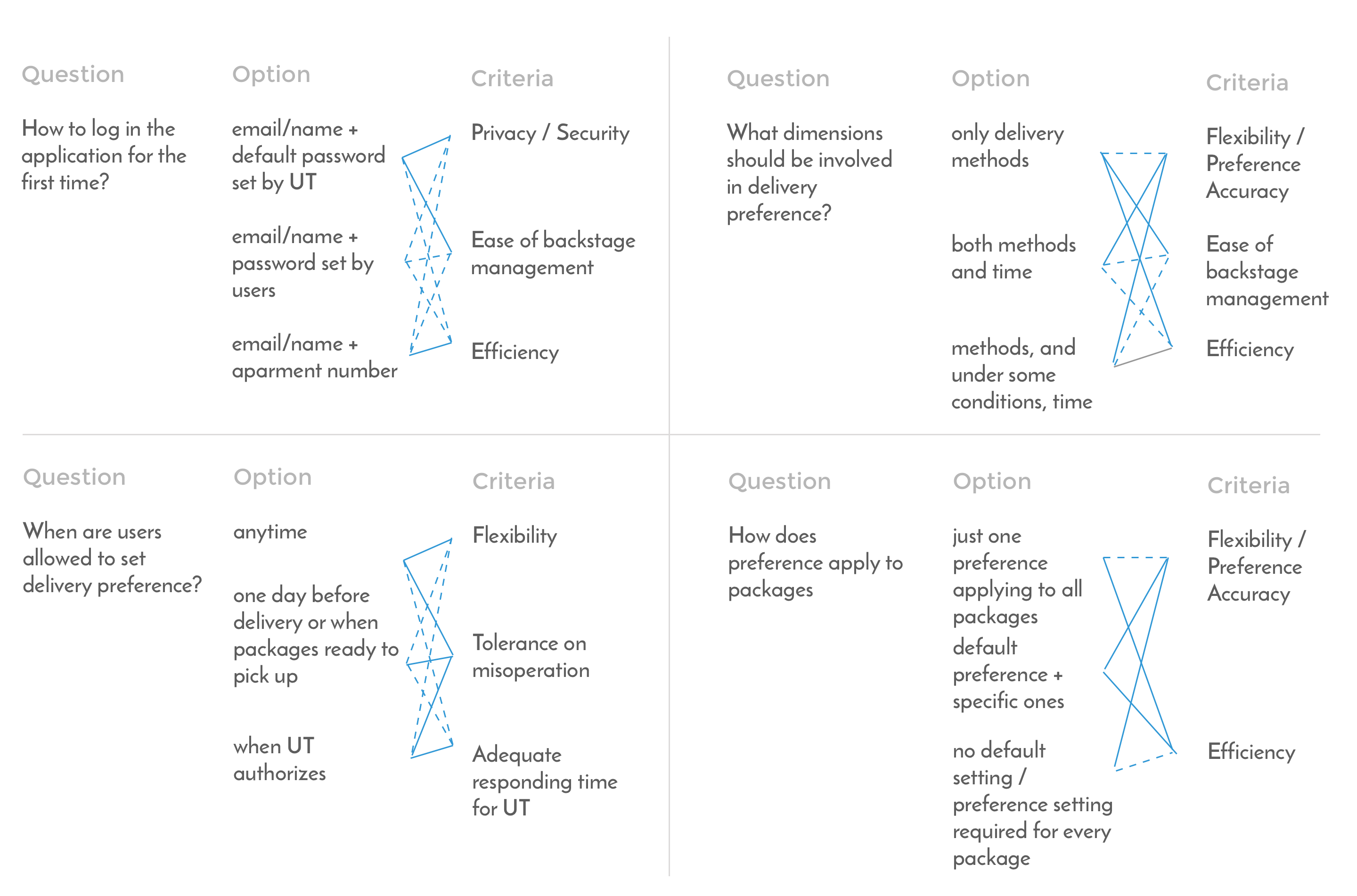 Among features above, setting community-based package delivery preference was the critical one customized for UT residents to maximize the user experience. To hone its usability, I came up with 3 approaches with different workflows to this feature and created QOC (questions, options, criteria) diagrams to make the final decision.