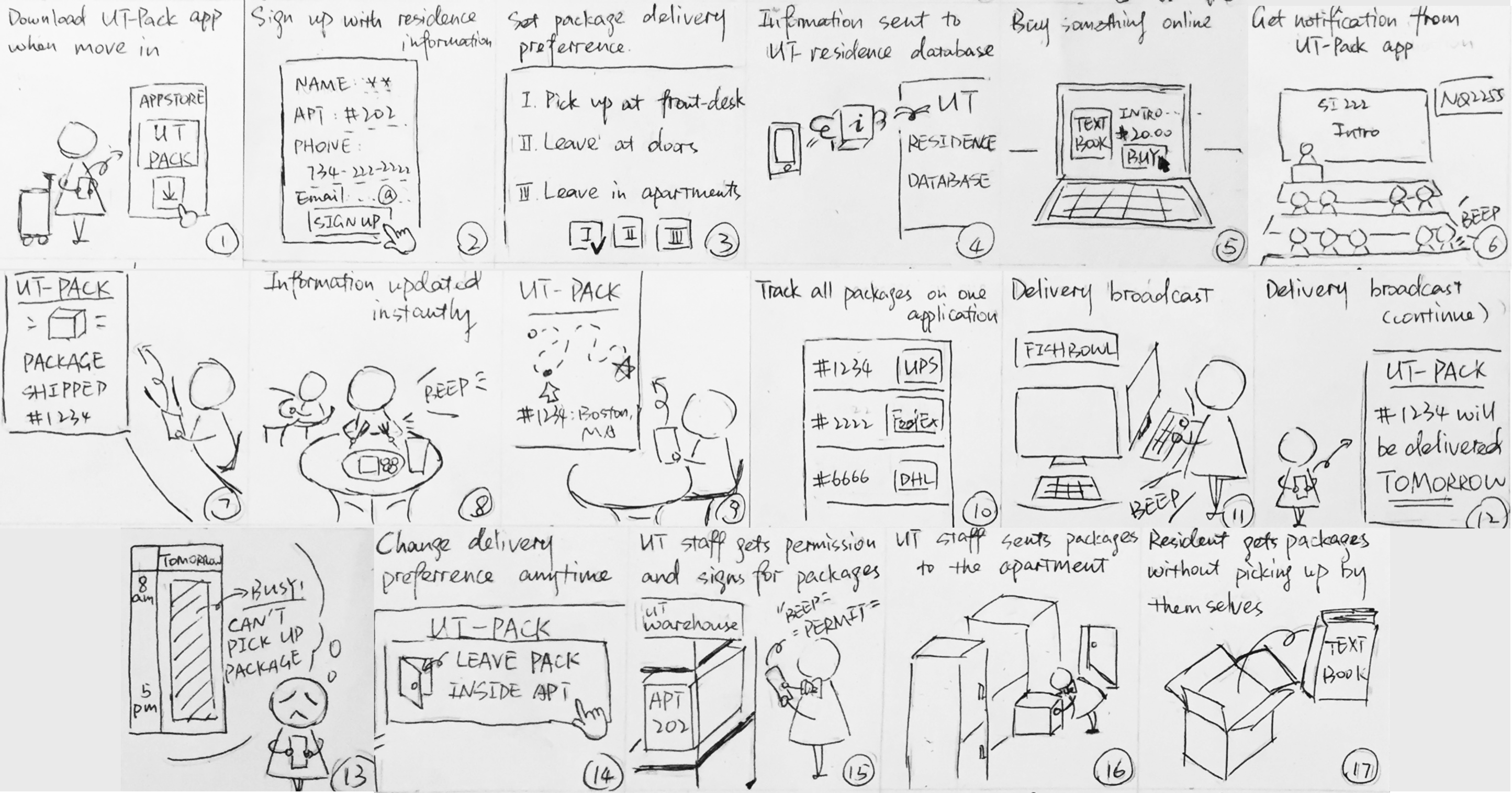 Leveraging existing residence information and customizating the app for UT residents can best improve the usability, at the same time differentiate it from other competitors. According to previous research results, U-Pack should enable users to: track packages on a unified platform no matter which delivery service is used; get delivery broadcast and instant notification as long as packages are ready to pick up; set their package delivery preference;